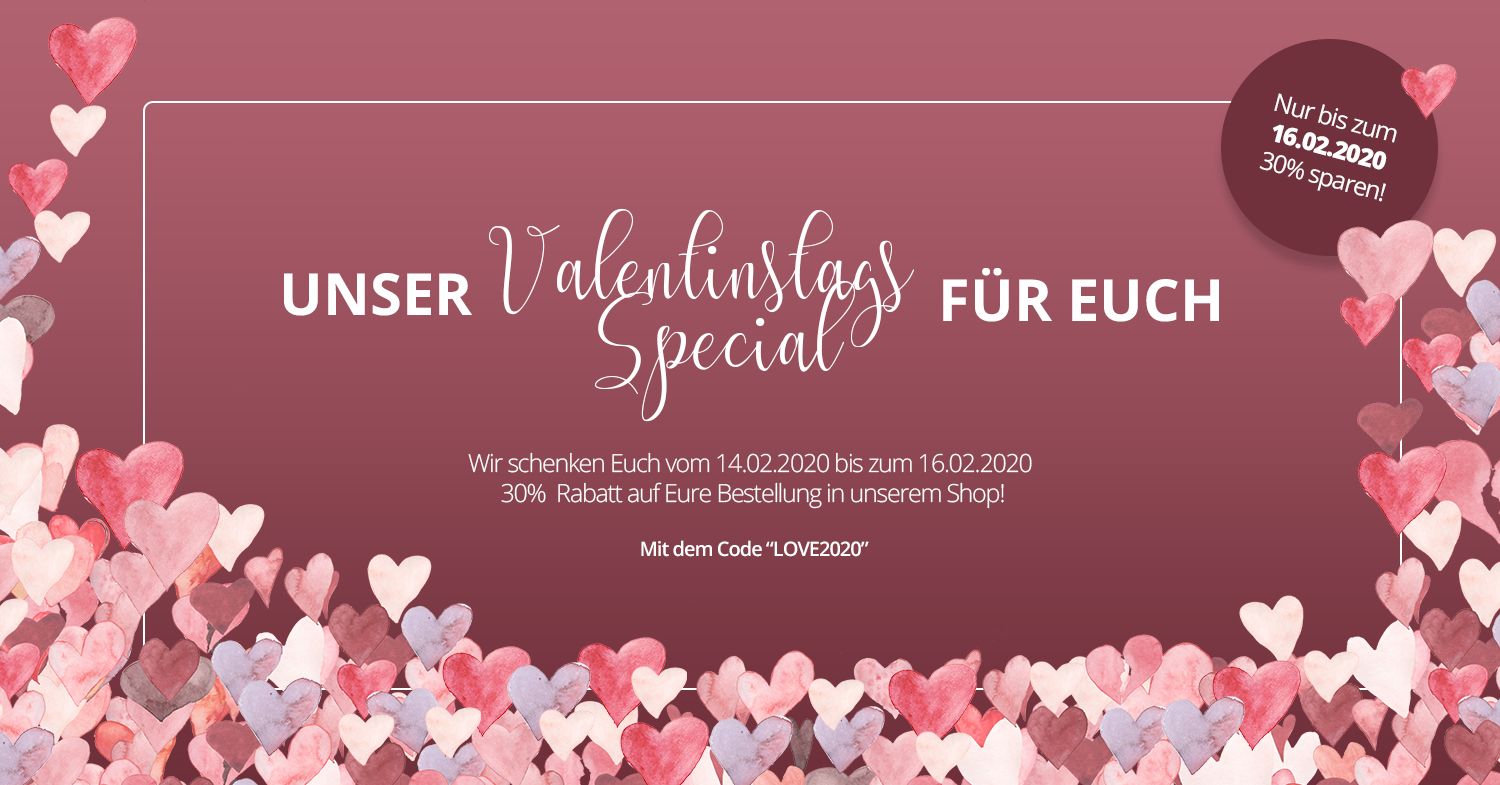 Mit dem Code „LOVE2020“ spart Ihr vom 14.02.2020 bis zum 16.02.2020 30% auf Eure Bestellung in unserem Shop. Aber seit schnell, der Countdown läuft!