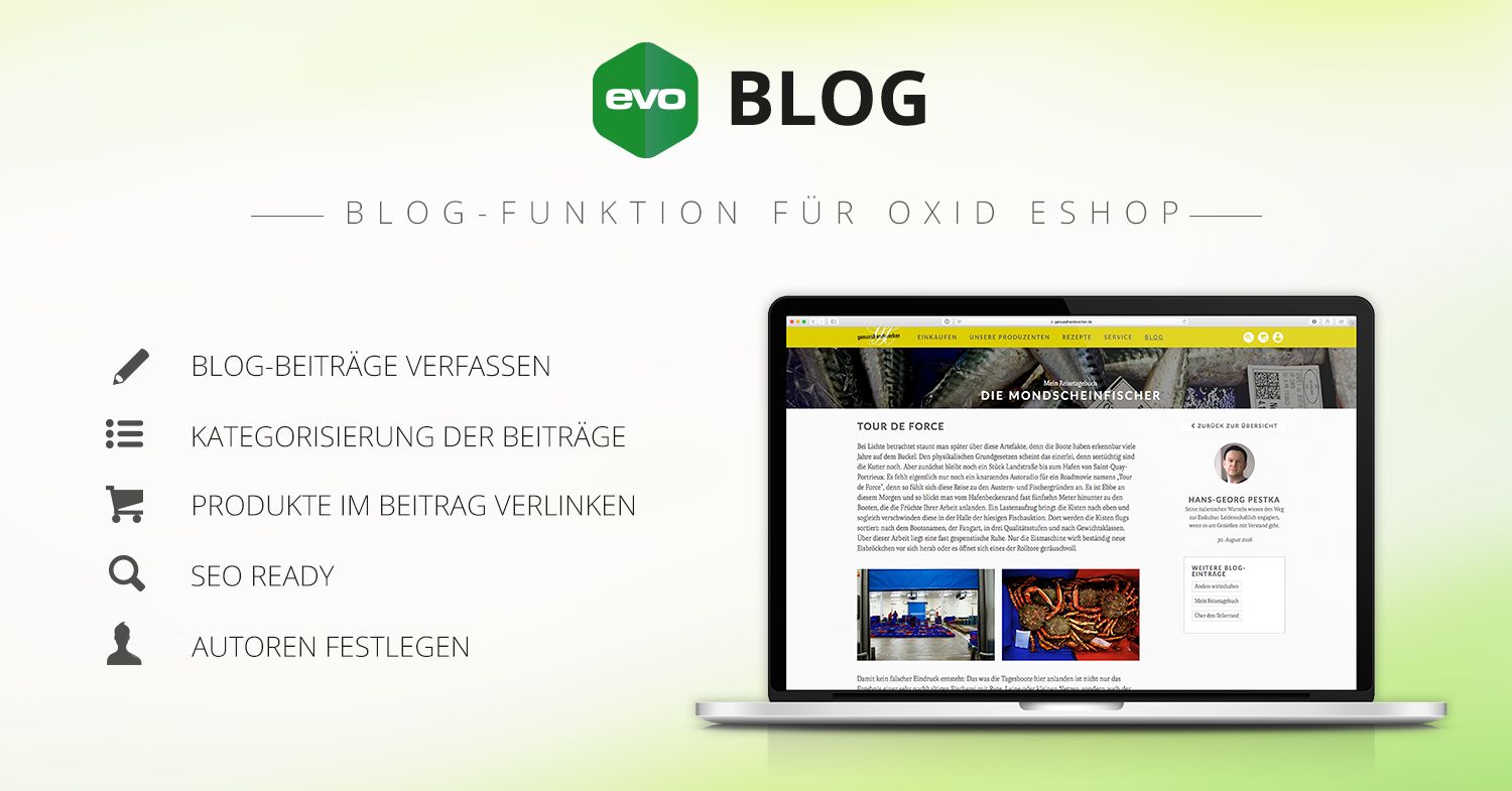 Mit unserem evoBLOG Modul können Sie Blog-Beiträge direkt im Backend von OXID anlegen und verwalten! Sie können unter anderem auch die Beiträge kategorisieren, Autoren-Profile anlegen und passende Produkte direkt im Beitrag verlinken.
