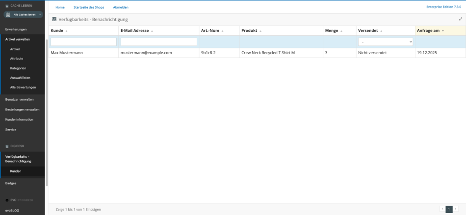 Über dieses Modul können sich Shopkunden für ausverkaufte Artikel registrieren, um benachrichtigt zu werden, wenn diese wieder verfügbar sind. Der Shopinhaber hat über dieses Modul auch eine Aussage, für welche Produkte sich seine Kunden interessieren, um entsprechende Nachkäufe zu organisieren oder bei Rückläufern die Kunden entsprechend zu benachrichtigen.
